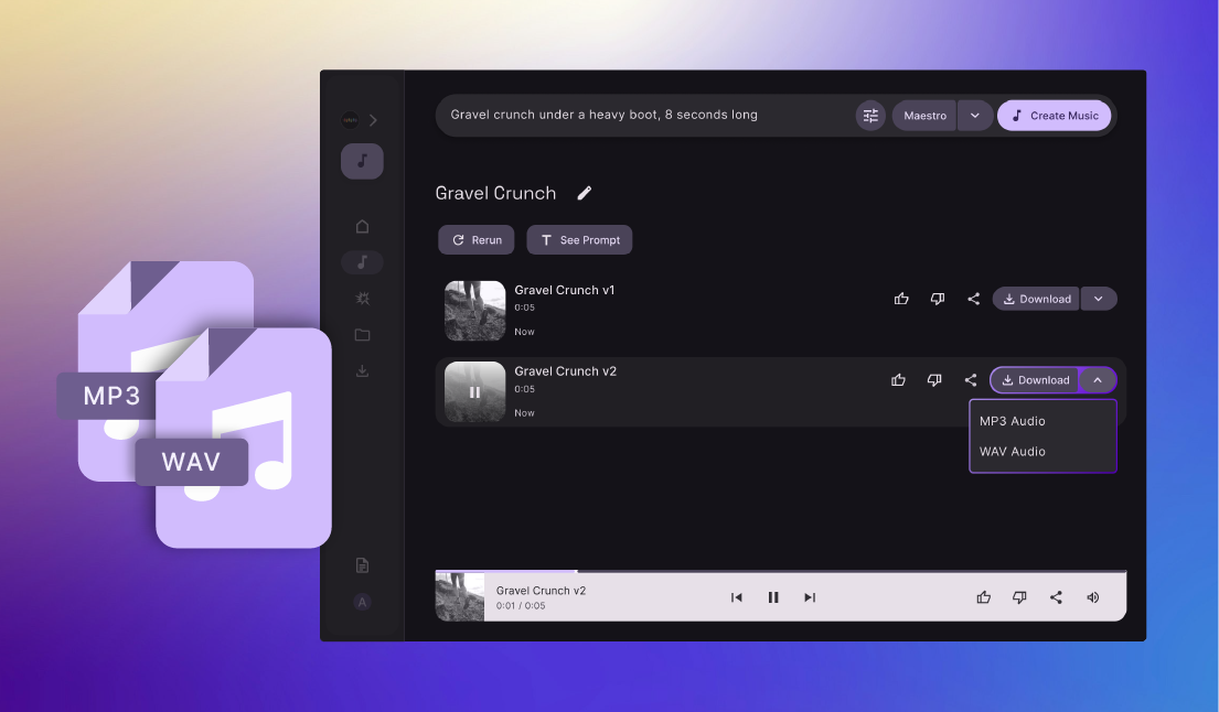 Forget stock tracks. Just describe the background music that fits your content, and watch maestro - our homegrown AI model - craft a unique, perfect soundtrack instantly.
